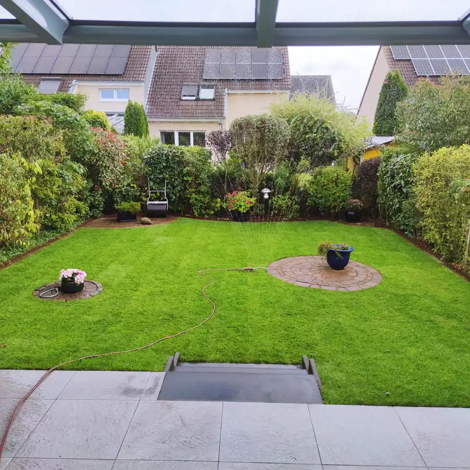 - Rasenpflege: Schneiden, Mulchen, Düngen, Bewässern, Vertikutieren